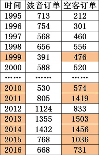1999~2016年的18年中,有15年空客的飞机订单数量超过波音。